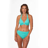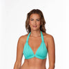 Designed with functional halter ties, it allows for a customizable fit that flatters the shoulders and enhances natural curves. Soft sewn-in cups provide gentle shaping, while the smooth stretch fabric ensures comfort and durability. Offering UPF 50 protection, this classic halter bikini top is perfect for sun-soaked days at the pool or beach.
